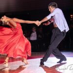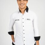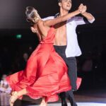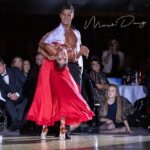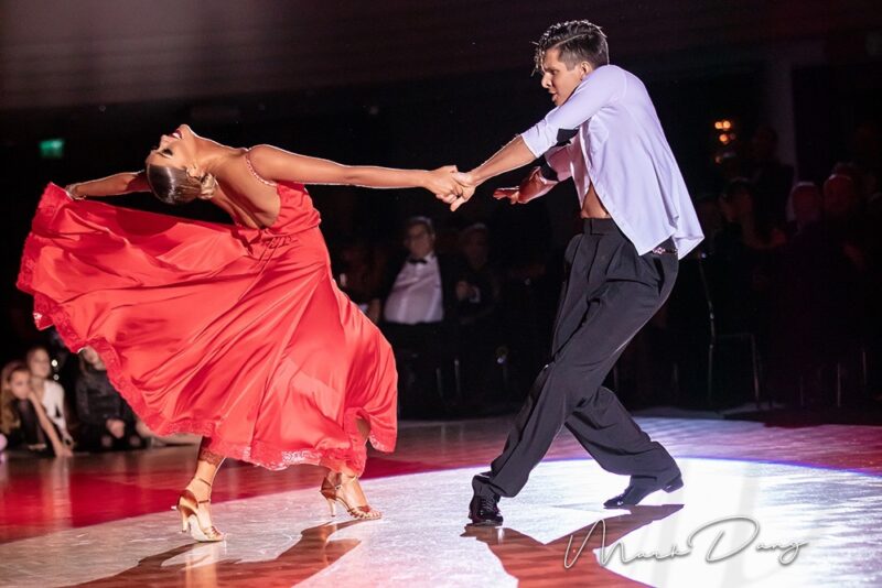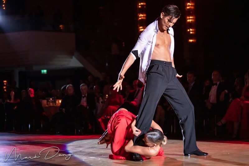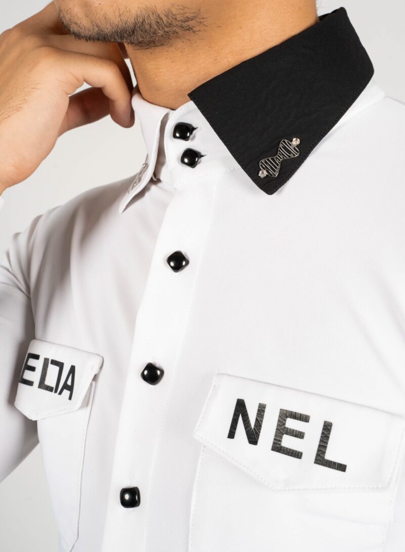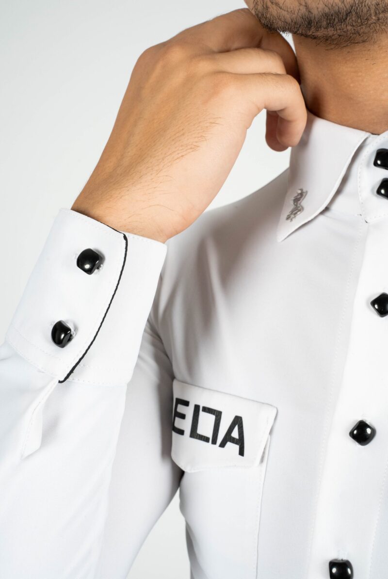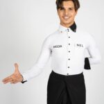 Our white shirt with black accents is suitable for both – standard and latin. On the chest are two pocket imitations. The high collar in black and white is not only modern, but also makes the back look longer. With the angular design of the collar you are guaranteed to look very trendy. The collar can be closed with 2 black buttons or worn open. Thanks to a special cut on the neck and the tight fit of the sleeves, the shirt stays perfectly in position even when the arms are raised. You can decide how you wish to wear your shirt – in the pants or over. Feel free not to use it only during your own practice or teaching but also for shows, competitions or congresses. This is a real eye-catcher. For an amount of 19 Euro we can personalise your shirt as you wish.