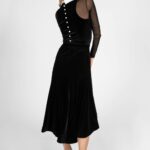 The upper part consists of three elements – net bodysuit, velvet vest and a collar decorated with Swarovski crystals.The collar is detachable. The back has a row of buttons with Swarovski crystals.