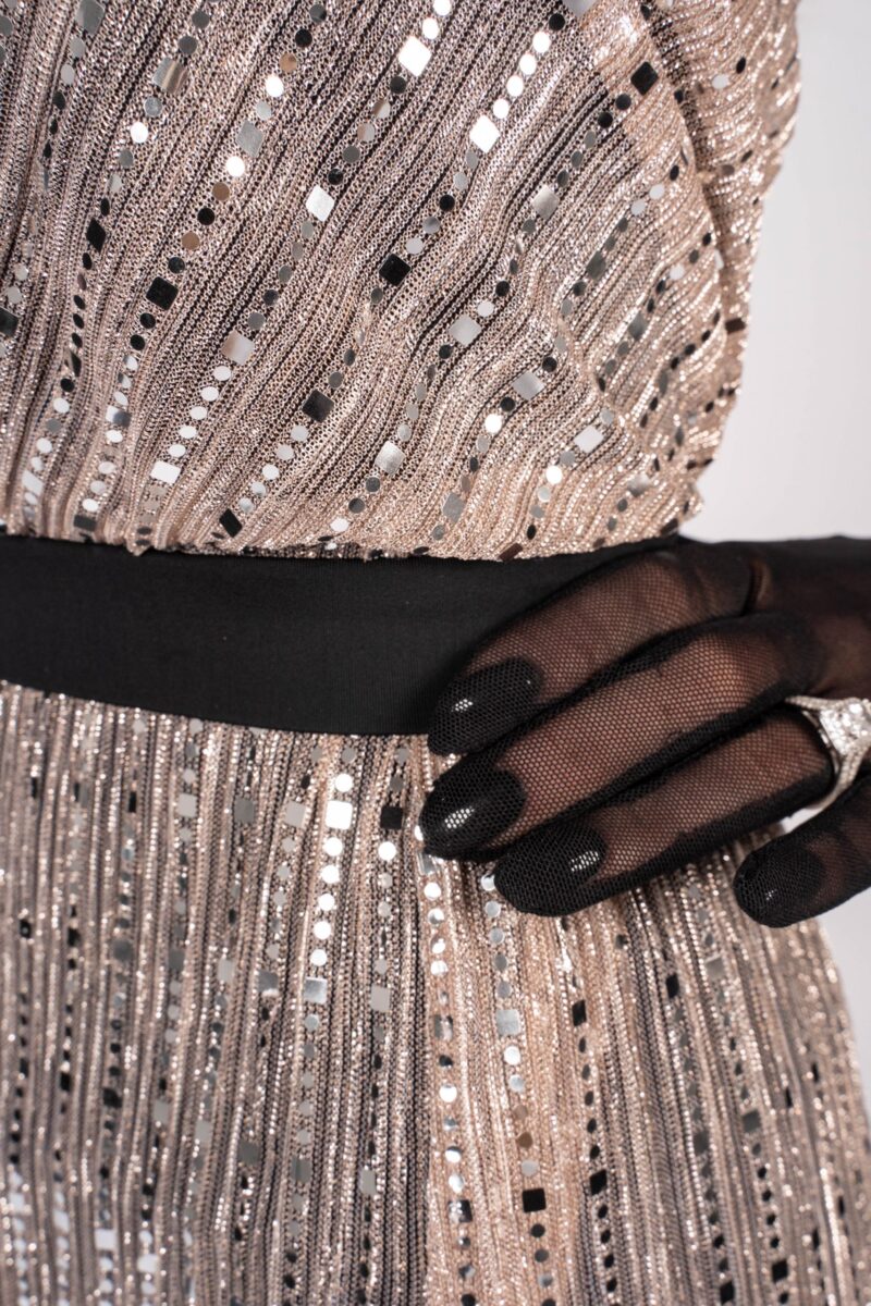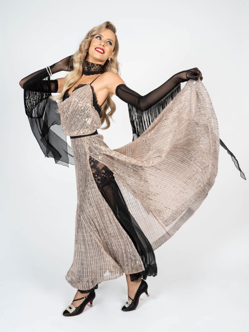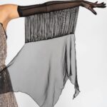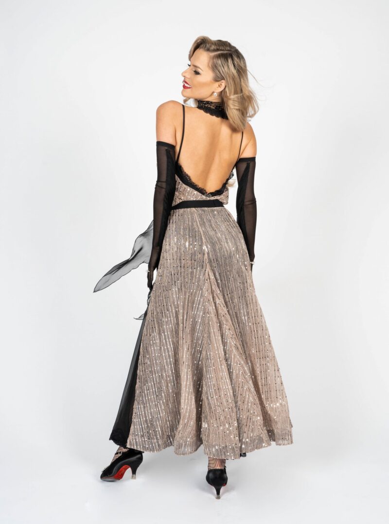 The shiny fabric in combination with the black net, acting as an under skirt, is a real eye-catcher. The gloves and the open back give the whole outfit its true elegance. It is decorated with Swarovski crystals. The black skirt from chiffon is removable and gives the whole outfit a completely new look. This dress is useable for competitions, unique shows or an elegant evening dress.