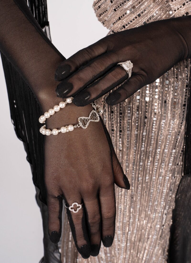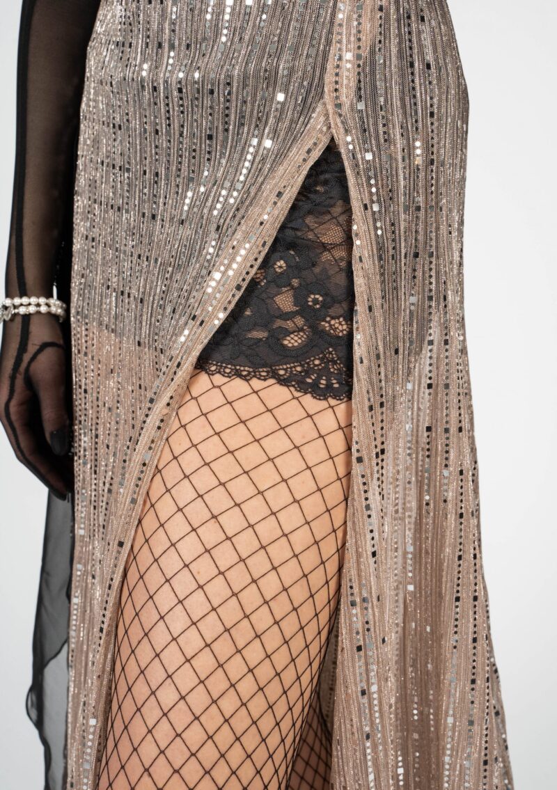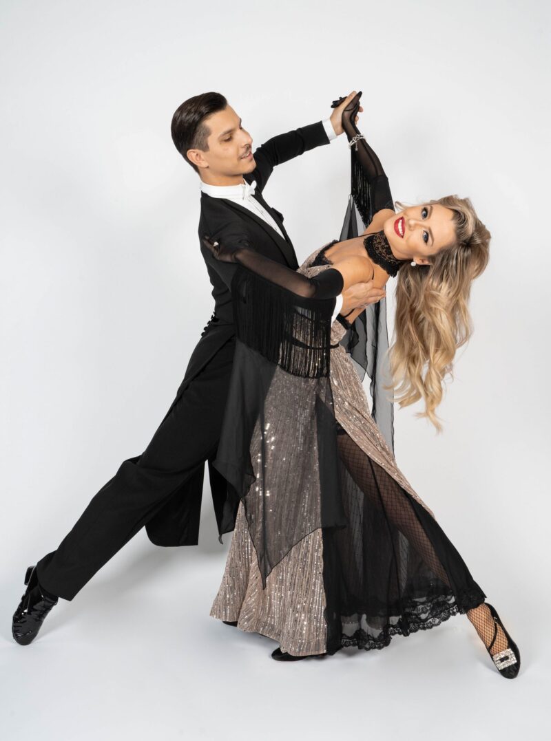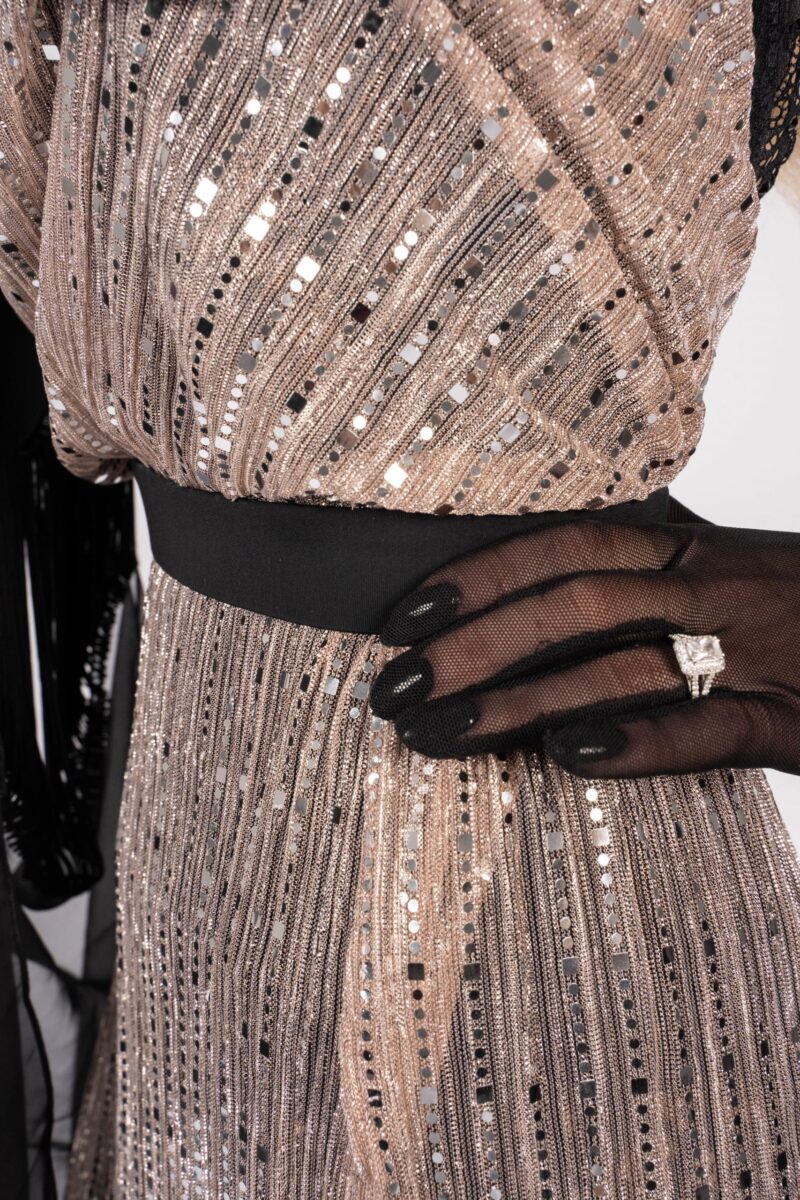 The shiny fabric in combination with the black net, acting as an under skirt, is a real eye-catcher. The gloves and the open back give the whole outfit its true elegance. It is decorated with Swarovski crystals. The black skirt from chiffon is removable and gives the whole outfit a completely new look. This dress is useable for competitions, unique shows or an elegant evening dress.
