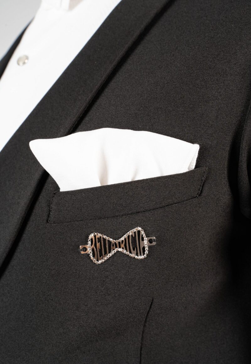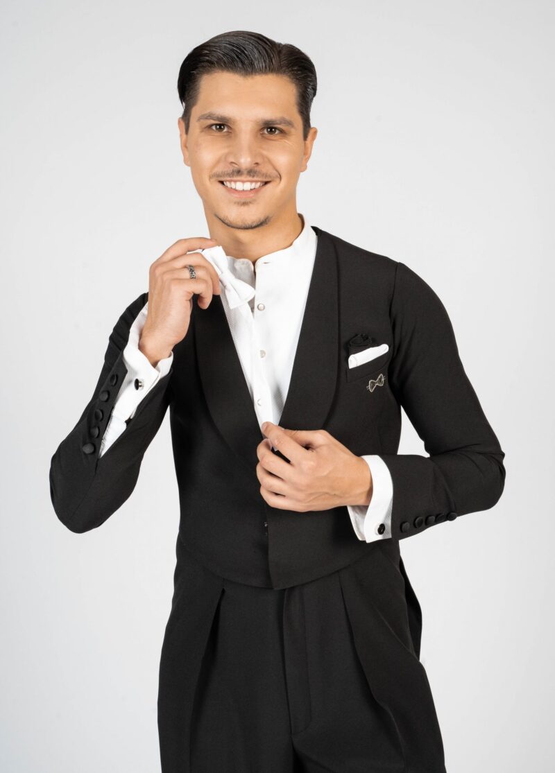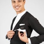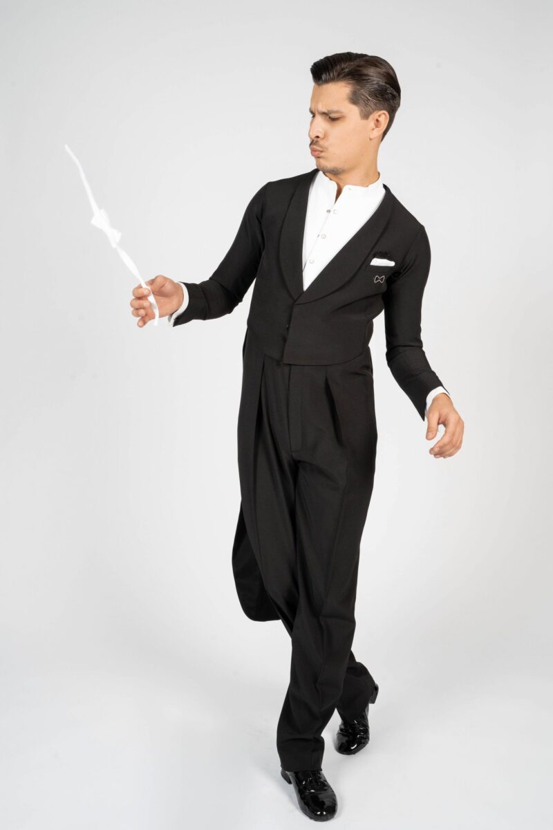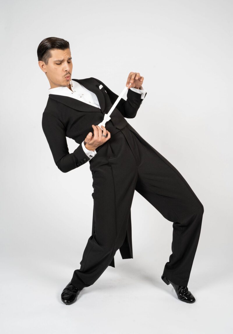 Our dance tail suit should revolutionise the dance world and give every gentleman a new feeling and a modern look. It has a completely trendy cut and brings every dancer to their top form. For our tail suit we have developed an innovative cut of the back line, making the collar only in the front and not in the neck area. This makes the back straighter, slimmer and thus looking longer. The front area of the collar is not angular as usual, but has a very trendy round neckline. The tail suit has no cummerbund. It emphasises the body and creates a sporty look. The front part closes slightly crosswise, making the tail suit not only contemporary, but also elegant and sporty. It is complemented by slim cut trousers. The pants have a special cut – they are wide in the upper part and slimmer in the lower part. This gives you both freedom of movement and longer legs. The main feature of our pants are the pleats, which go inwards. The sleeves and the back are adapted to the current trend with a row of chic buttons giving an elegant look. Our fabric is thin, elastic and breathable. With our tailcoat we promise not only a modern, elegant, sporty look but also maximum wearing comfort. Due to the special cut of the sleeves and shoulder line, the tailcoat is perfect in the dance position. Our concern is that the dancer feels comfortable both in the dance posture whilst dancing as well as on the side with the arms down. For this we have created a special design in the armpit and sleeve area. When the arms are down there is no longer a feeling of tension and discomfort. Our handkerchief in the left breast pocket gives the necessary elegant touch and is also available in other colours in addition to the usual black or white one.