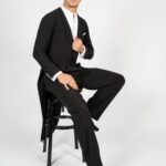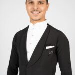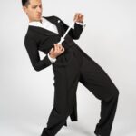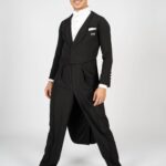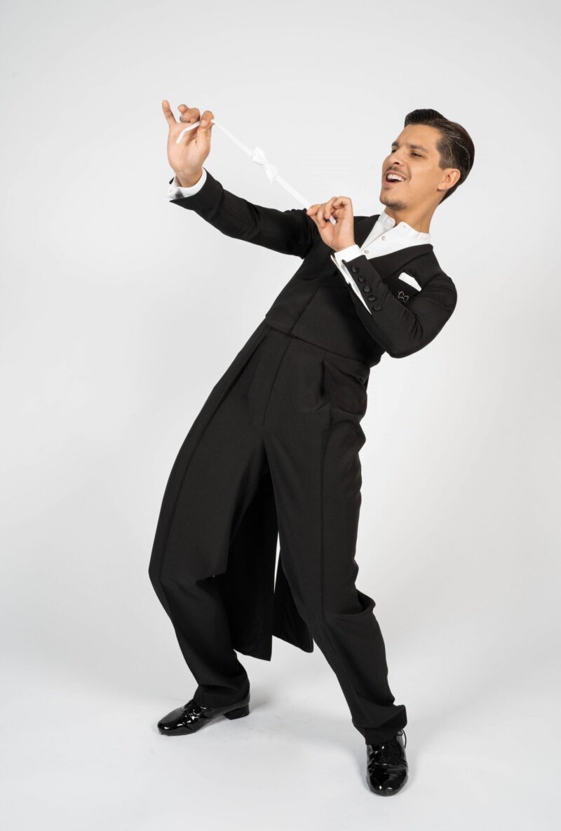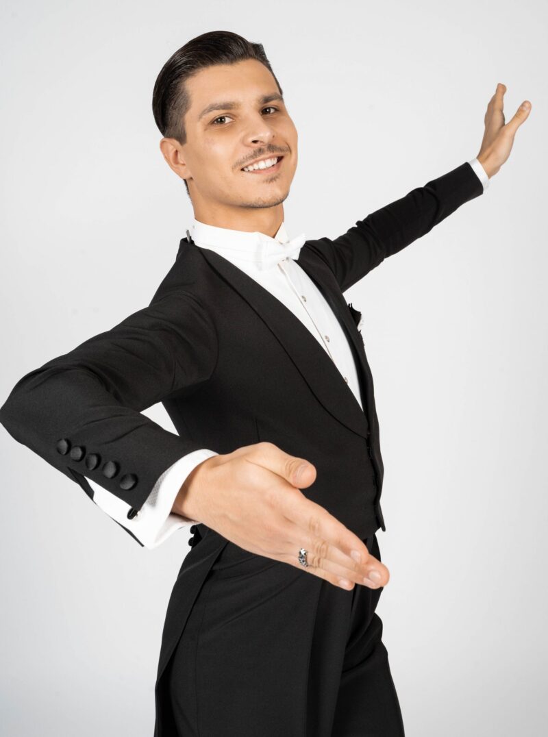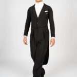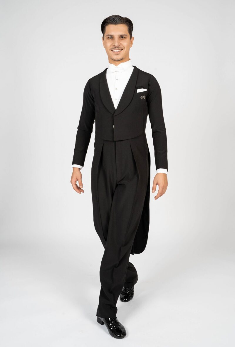 Our dance tail suit should revolutionise the dance world and give every gentleman a new feeling and a modern look. It has a completely trendy cut and brings every dancer to their top form. For our tail suit we have developed an innovative cut of the back line, making the collar only in the front and not in the neck area. This makes the back straighter, slimmer and thus looking longer. The front area of the collar is not angular as usual, but has a very trendy round neckline. The tail suit has no cummerbund. It emphasises the body and creates a sporty look. The front part closes slightly crosswise, making the tail suit not only contemporary, but also elegant and sporty. It is complemented by slim cut trousers. The pants have a special cut – they are wide in the upper part and slimmer in the lower part. This gives you both freedom of movement and longer legs. The main feature of our pants are the pleats, which go inwards. The sleeves and the back are adapted to the current trend with a row of chic buttons giving an elegant look. Our fabric is thin, elastic and breathable. With our tailcoat we promise not only a modern, elegant, sporty look but also maximum wearing comfort. Due to the special cut of the sleeves and shoulder line, the tailcoat is perfect in the dance position. Our concern is that the dancer feels comfortable both in the dance posture whilst dancing as well as on the side with the arms down. For this we have created a special design in the armpit and sleeve area. When the arms are down there is no longer a feeling of tension and discomfort. Our handkerchief in the left breast pocket gives the necessary elegant touch and is also available in other colours in addition to the usual black or white one.