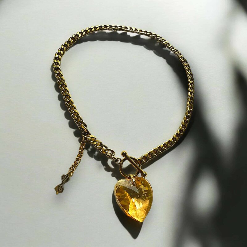 Dieses beeindruckende Schmuckstück vereint Luxus und Modernität auf elegante Weise. Im Mittelpunkt steht ein imposantes Swarovski-Herz in einem schimmernden Goldton, das durch seine majestätische Präsenz besticht. Der stilvolle Verschluss des Herzanhängers ist kunstvoll gestaltet und fügt sich nahtlos ineinander, was dem Design eine besondere Raffinesse verleiht.