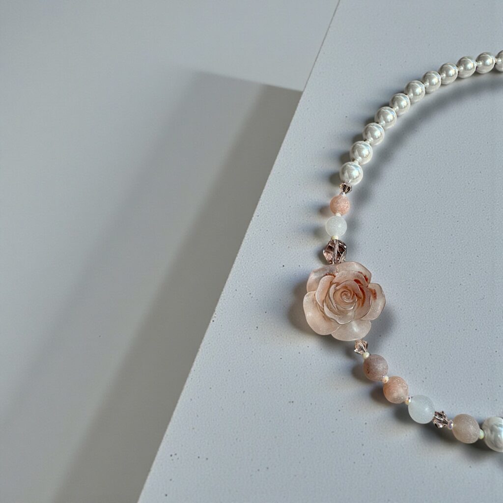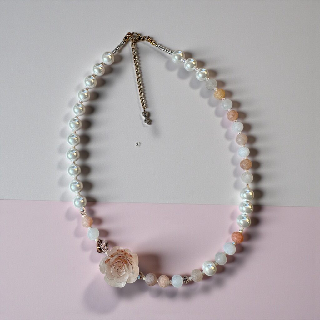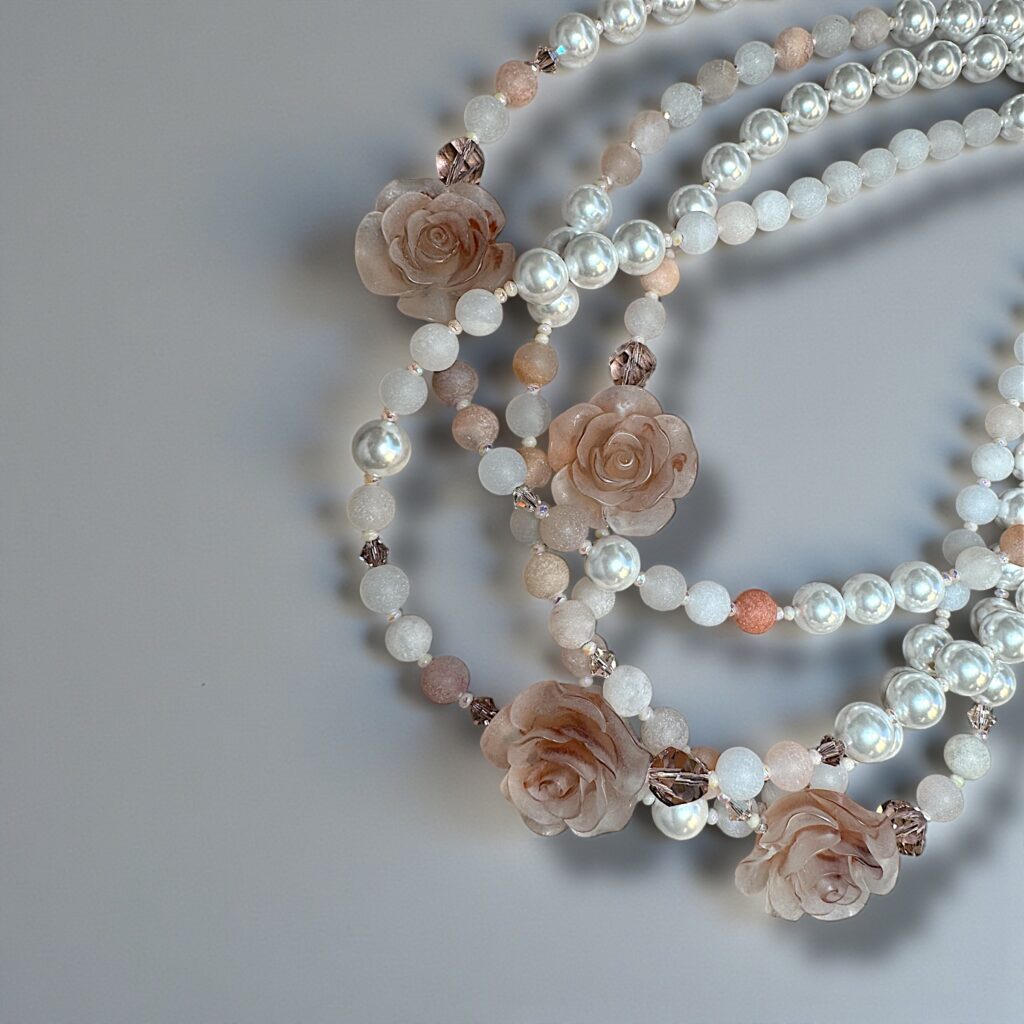 Verarbeitet wurden natürliche, echte Steine, fein abgestimmte Glasperlen sowie funkelnde Swarovski Kristalle, die dem Schmuckstück eine außergewöhnliche Tiefe und einen luxuriösen Glanz verleihen. Die Kombination dieser Materialien sorgt für einen echten Wow-Effekt und macht jede Kette zu einem Blickfang.