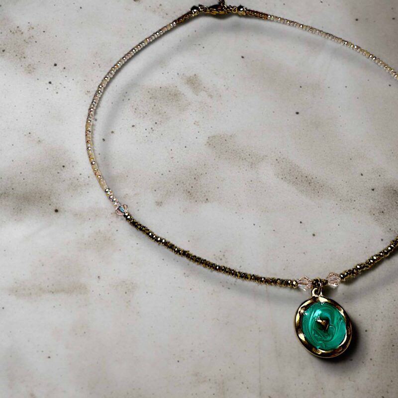 Diese edle Halskette vereint zeitloses Design mit luxuriösen Details: Ein handgefertigter Anhänger – wahlweise in Pink, Grün oder Weiß – wird von einem zarten Rahmen aus vergoldetem Edelstahl eingefasst. Feine Swarovski-Kristalle setzen funkelnde Akzente, während die hochwertigen Edelstahlperlen für langlebige Eleganz sorgen. Ob als farbenfrohes Statement in Pink, als natürlicher Akzent in Grün oder in klassischem Weiß – dieses Schmuckstück strahlt in jeder Variante stilvolle Individualität und feminine Stärke aus.