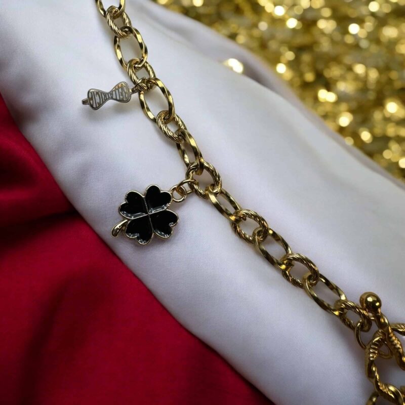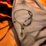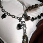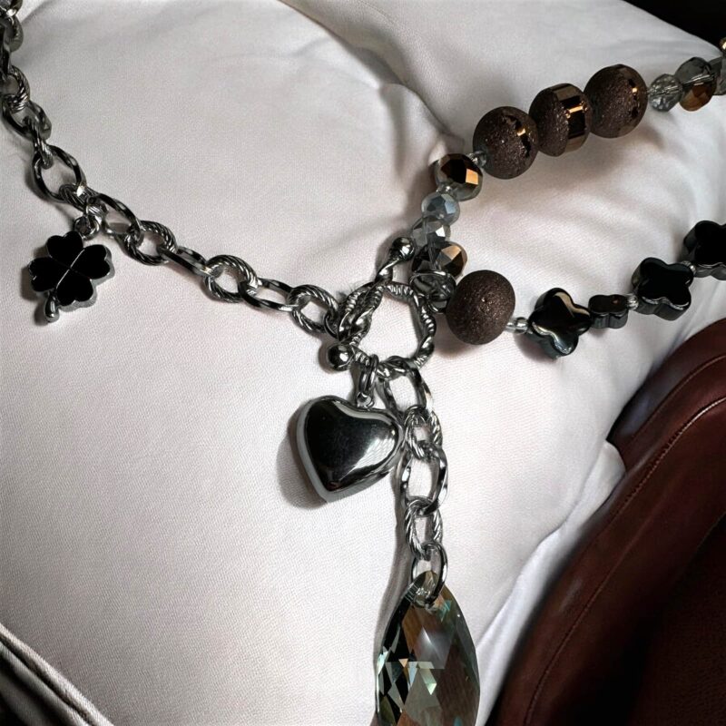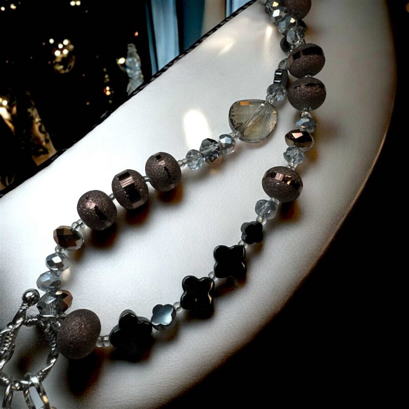 Dieses außergewöhnliche Schmuckstück erzählt eine Geschichte von Natur, Wandel und Eleganz. Auf der einen Seite funkelt eine zeitlose Kette mit einem schwarzen Blattanhänger – ein Symbol für die Schönheit des Herbstes und die Vergänglichkeit der Natur. Die andere Seite der Kette ist aus Glasperlen gestaltet, die den Eindruck verwelkter Blätter einfangen, und wird durch kleine Glas- und Swarovski-Kristalle perfekt ergänzt.