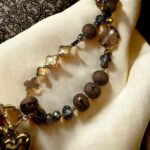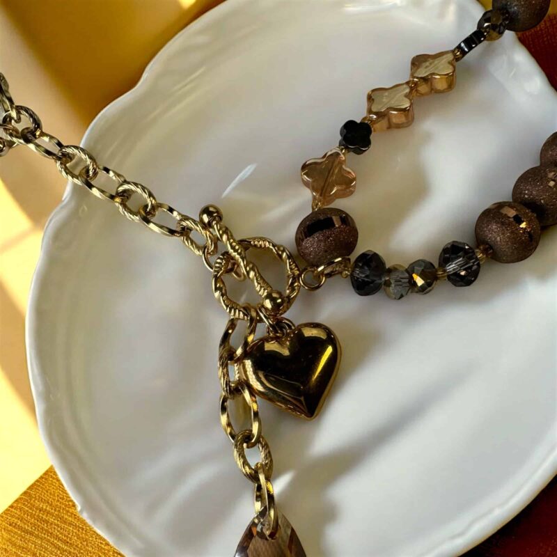 Ein weiterer Swarovski-Kristall schmückt die Seite der Kette und wird von erdigen, braunen Glasperlen umrahmt, die perfekt die Farben des Herbstes widerspiegeln. Diese edle Kombination von Natur- und Glanzelementen macht die Halskette zu einem Accessoire, das dich durch die Herbsttage begleitet und deinem Look immer das gewisse Extra verleiht.