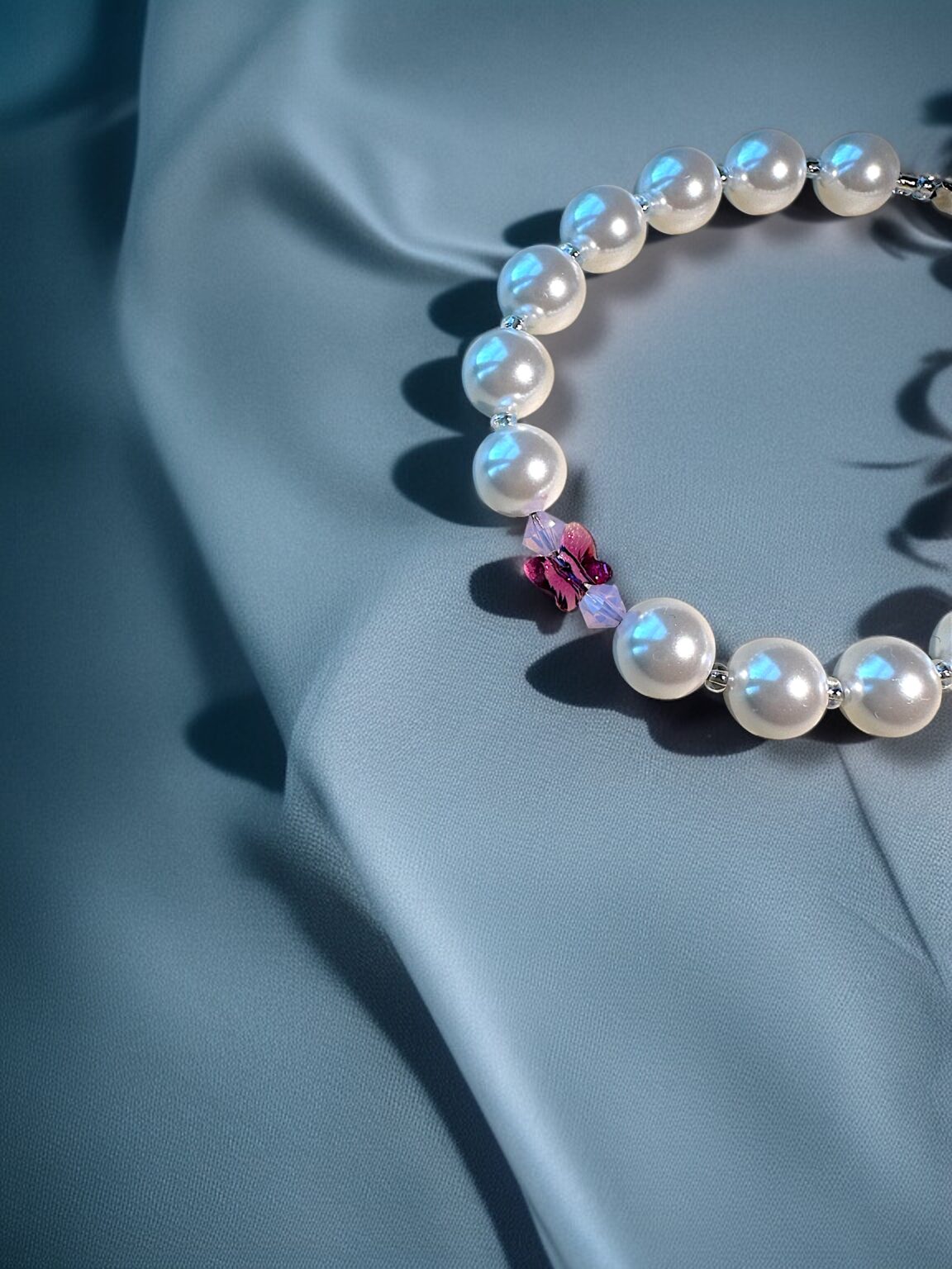 Dieses traumhafte Armband verzaubert mit seiner verspielten Eleganz: Edle Muschelperlen treffen auf einen filigranen Swarovski-Schmetterling, der in verschiedenen Farben schimmert und je nach Lichteinfall neue Facetten offenbart. Ergänzt wird das Design durch funkelnde Swarovski-Kristalle, die dem Armband zusätzlichen Glanz und eine luxuriöse Ausstrahlung verleihen.