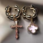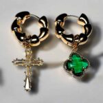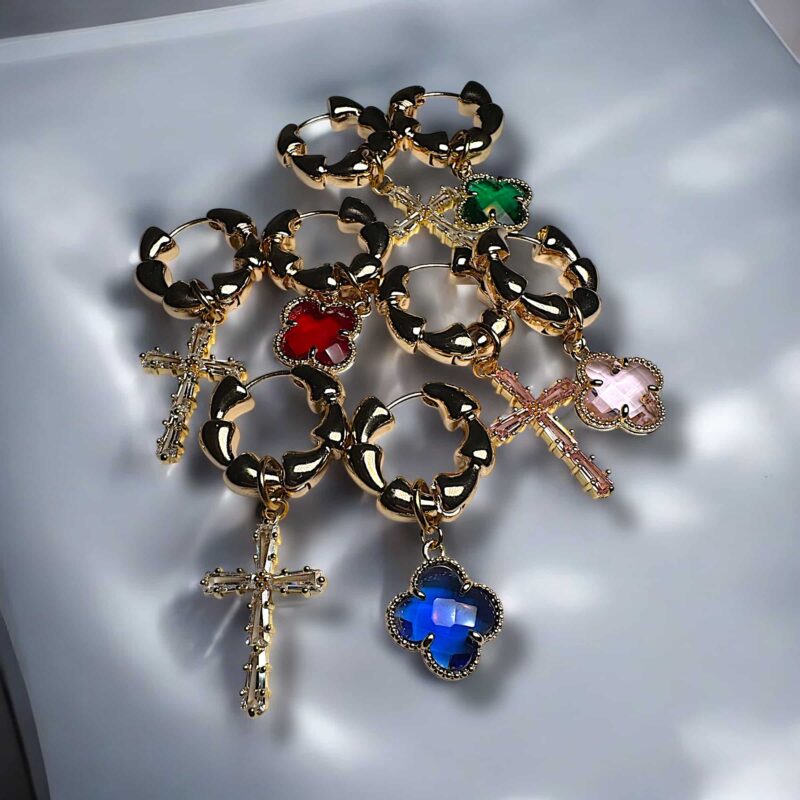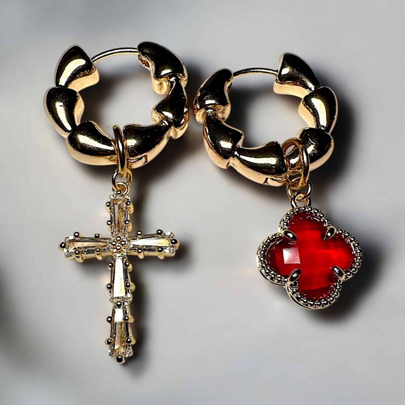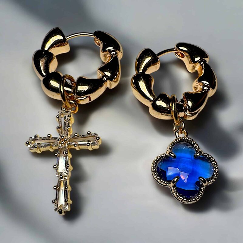 Die abgebildeten Ohrringe zeigen ein hochwertiges Design mit goldenen, strukturierten Creolen. Einer trägt ein funkelndes Kreuz aus klaren Steinen, der andere einen eleganten Kleeblatt-Anhänger mit schimmerndem blauen Stein.