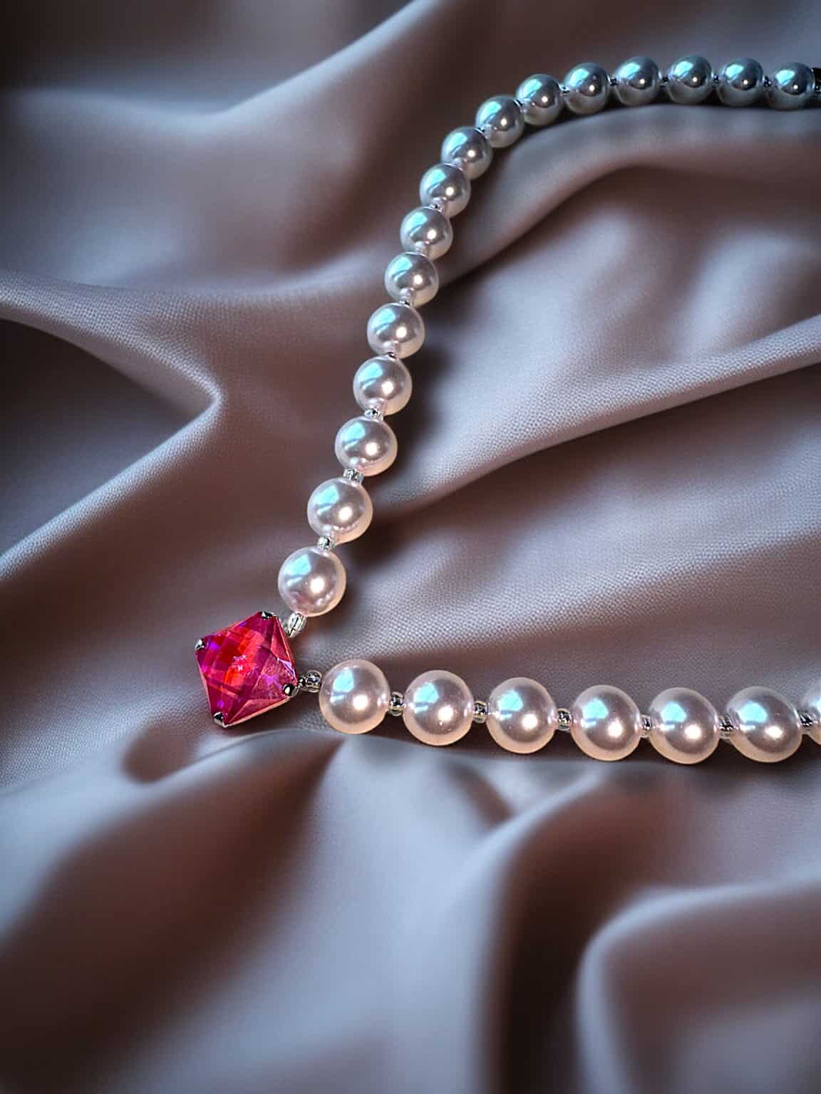 Diese edle Kette vereint klassische Muschelperlen mit modernem Swarovski-Design. Zwischen die Perlen sind vier verschiedene Swarovski-Anhänger eingefasst, die bei jedem Lichtwechsel in unterschiedlichen Facetten funkeln und der Kette eine luxuriöse und zugleich verspielte Ausstrahlung verleihen.