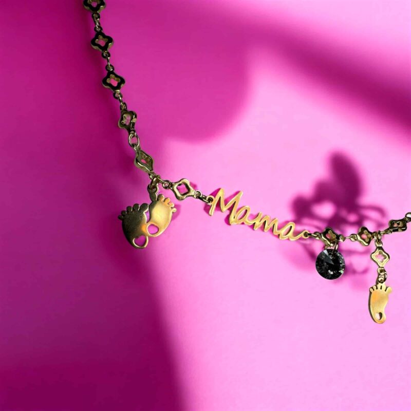 Diese einzigartige Halskette ist ebenso besonders wie jede Geburt und jeder Mensch selbst. Sie wurde speziell für Mamas kreiert, um die besondere Verbindung zwischen Mutter und Kind zu würdigen. Im Mittelpunkt der Kette steht das Wort **”Mama”**, das durch kleine Fußabdrücke auf beiden Seiten ergänzt werden kann – ganz nach Anzahl der Kinder: 1, 2 oder 3.
