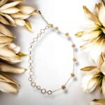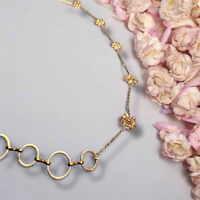 Das verspielte Arrangement der Elemente bricht mit klassischen Formen und macht die Kette zu einem stilvollen Statement-Piece. Die glänzenden Oberflächen der Blumen reflektieren das Licht sanft und schaffen einen warmen, luxuriösen Schimmer, der die Haut strahlen lässt.