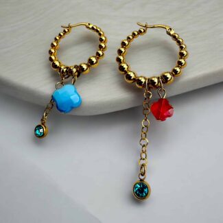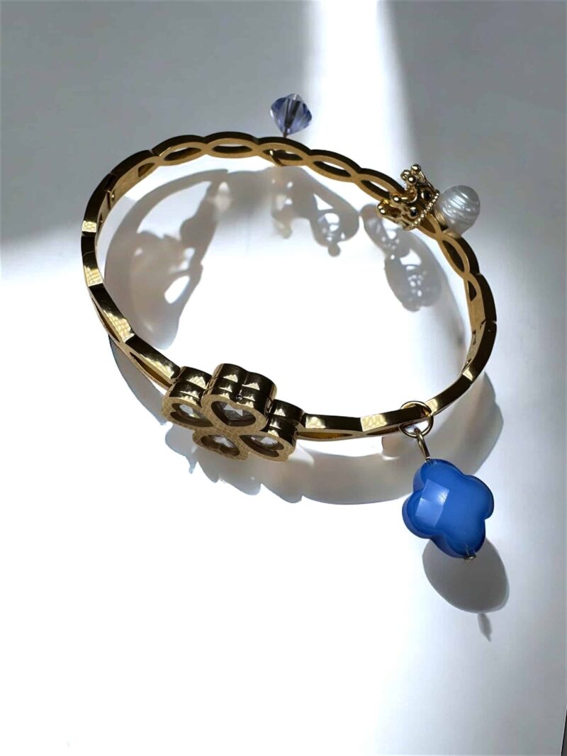 Im Zentrum steht ein filigranes Kleeblatt, besetzt mit funkelnden Zirkonia- und Swarovski-Kristallen, das Glück und Eleganz vereint. Ein zart schimmernder blauer Kristall setzt einen besonderen Akzent und macht jedes Stück zu einem einzigartigen Blickfang.