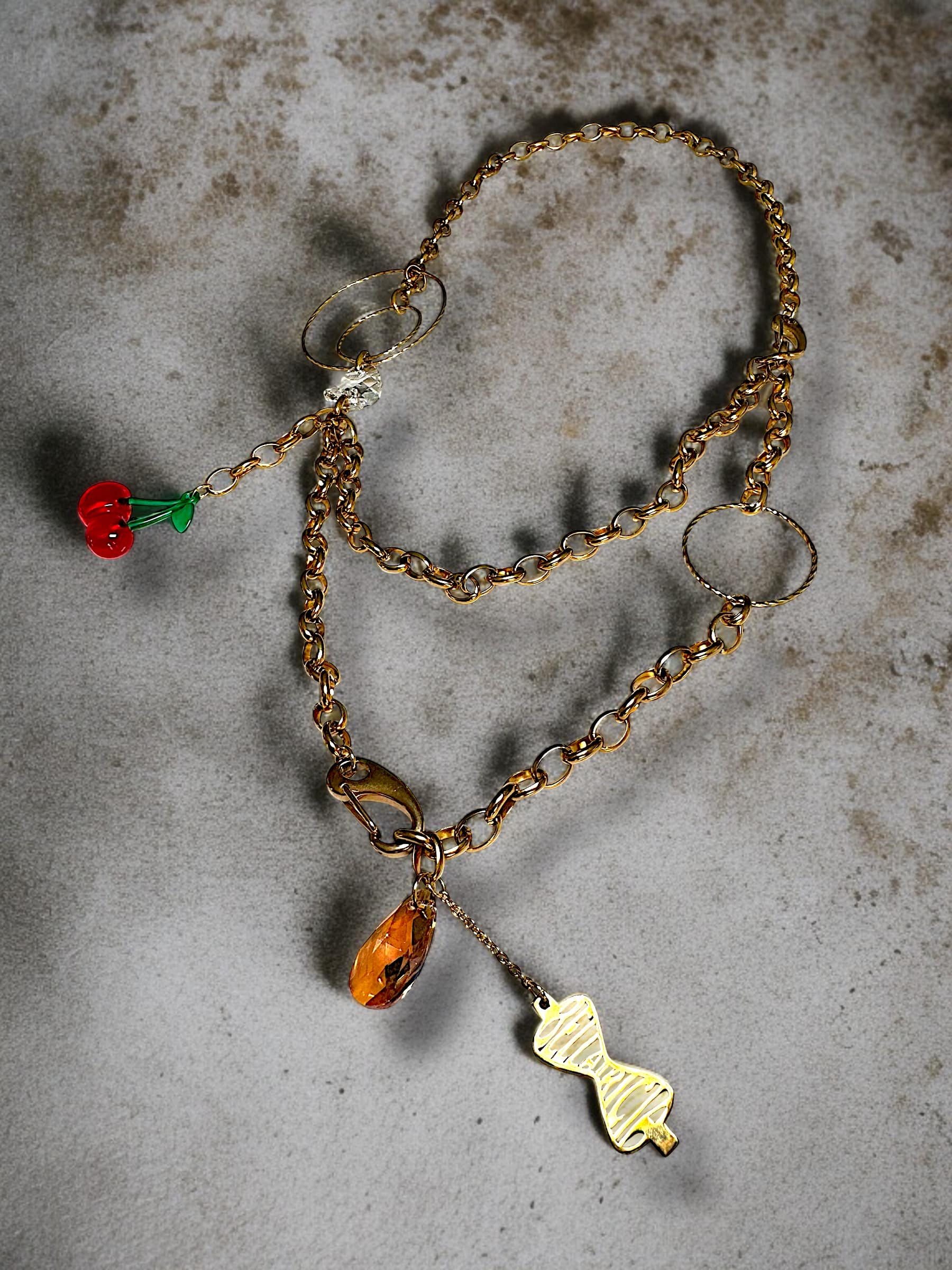 Diese überlange goldene Kette verkörpert pure Eleganz und zeitlosen Luxus. Im Zentrum steht ein großer, facettierter Swarovski-Kristall in einem tiefen, glänzenden Braunton – ein Statement voller Wärme und Raffinesse.