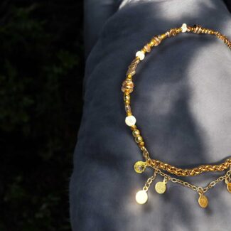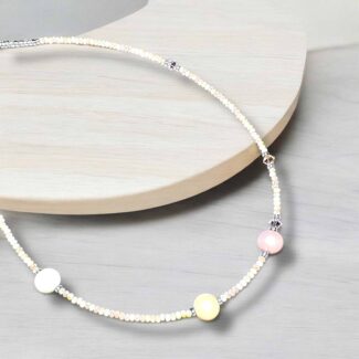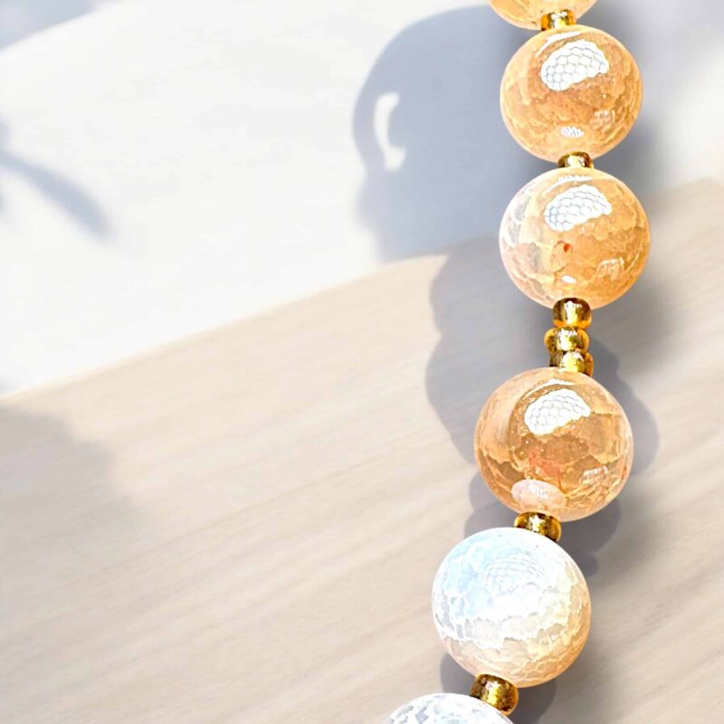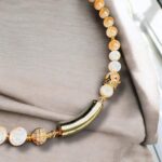 Diese elegante Halskette besticht durch ihre wunderschönen, marmorierten Natursteine in sanften Beige- und Goldtönen. Die harmonische Kombination wird durch funkelnde Zirkonia-Steine und strahlende Swarovski-Kristalle veredelt, während filigrane goldene Elemente einen Hauch von Luxus verleihen. Leichte Acryl-Details sorgen für eine moderne Note und machen das Schmuckstück zu einem perfekten Begleiter für stilvolle Looks.