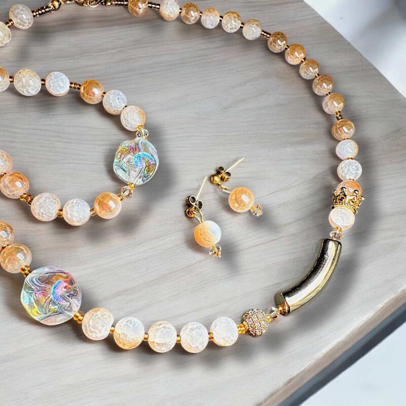 Diese stilvollen Ohrringe vereinen marmorierte Natursteine in sanften Beige-Tönen mit funkelnden Swarovski-Kristallen. Die goldenen Akzente verleihen dem Design eine edle Note, während die Kombination aus natürlichen und glanzvollen Elementen eine perfekte Balance aus Eleganz und Modernität schafft. Ein zeitloses Schmuckstück, das jedem Look eine raffinierte Ausstrahlung verleiht.