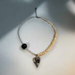 Die Kette selbst ist ein harmonisches Zusammenspiel aus echten Perlen, die auf einer Seite einen Hauch von klassischer Schönheit verleihen, und funkelnden Glasskristallen, die der anderen Seite einen modernen Glanz geben.