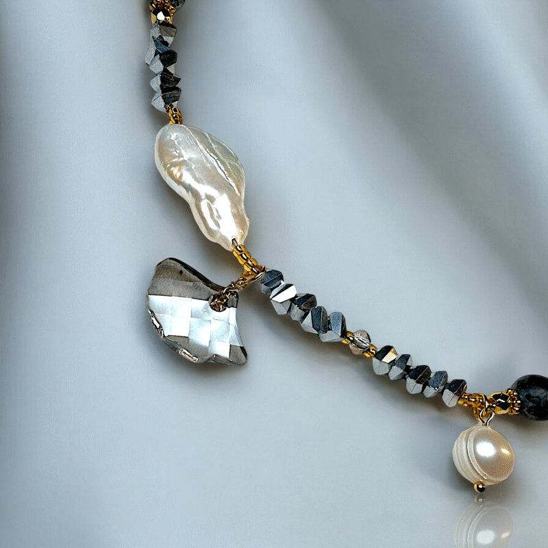 Diese außergewöhnliche Halskette vereint eine Vielzahl hochwertiger Materialien, die zu einem harmonischen Gesamtbild verschmelzen. Auf der einen Seite sind matte Labradorit-Perlen in ihrer natürlichen Schönheit eingefasst. Ihr dezenter, schimmernder Glanz reflektiert das Licht in zarten Grautönen und bringt die mystische Ausstrahlung dieses Natursteins besonders zur Geltung.