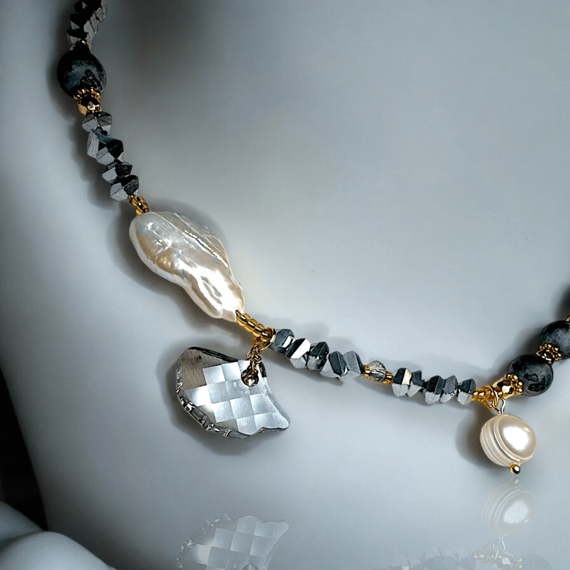 Materialien: Mattes Labradorit-Mineral (Naturstein) | Barock Perle | Echte Perle | Swarovski Kristalle | Dreieckskristalle | Edelstahl