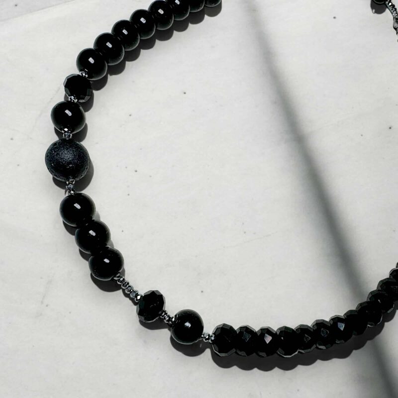 Diese Halskette verbindet schwarze Glaskristalle in geometrischen Formen mit glänzenden, schwarzen Glasperlen. Das elegante und zugleich minimalistische Design passt perfekt zu jedem Stil, ob für Männer oder Frauen. Die tiefschwarzen Kristalle verleihen dem Schmuckstück eine geheimnisvolle Eleganz, während der dezente Glanz der Perlen für einen Hauch von Luxus sorgt. Ein vielseitiges Accessoire, das jedem Outfit das gewisse Etwas verleiht.