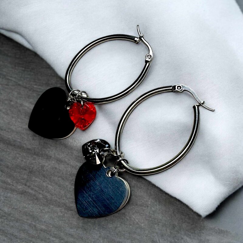 Entdecke die funkelnde Schönheit unserer Radiant Heart Earrings. Diese auffälligen Ohrringe bestehen aus zwei großen, spiegelnden Herzen, die mit ihrem intensiven Glanz jedes Outfit aufwerten. Zwei charmante Swarovski-Herzchen in grau-silber und rot verleihen diesen Ohrringen eine zusätzliche Note von Eleganz und Farbbrillanz.
