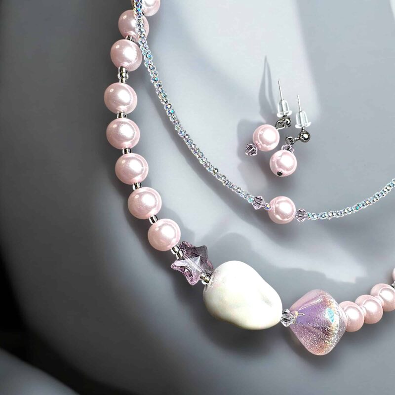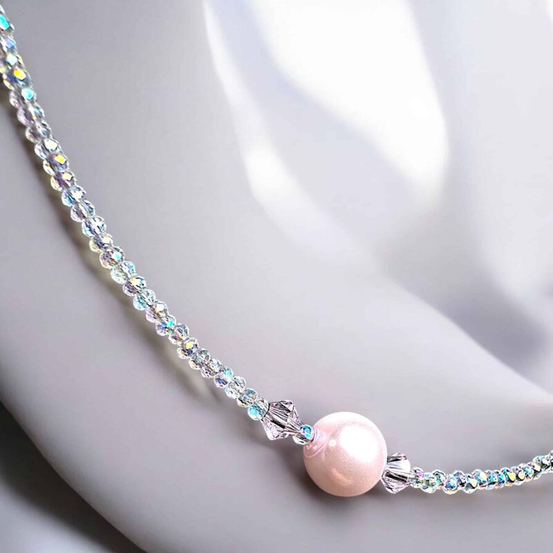 “Rosé Lumen” – Feine Perlenkette mit Swarovski-Kristallen und Babyrosa Muschelperle