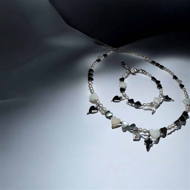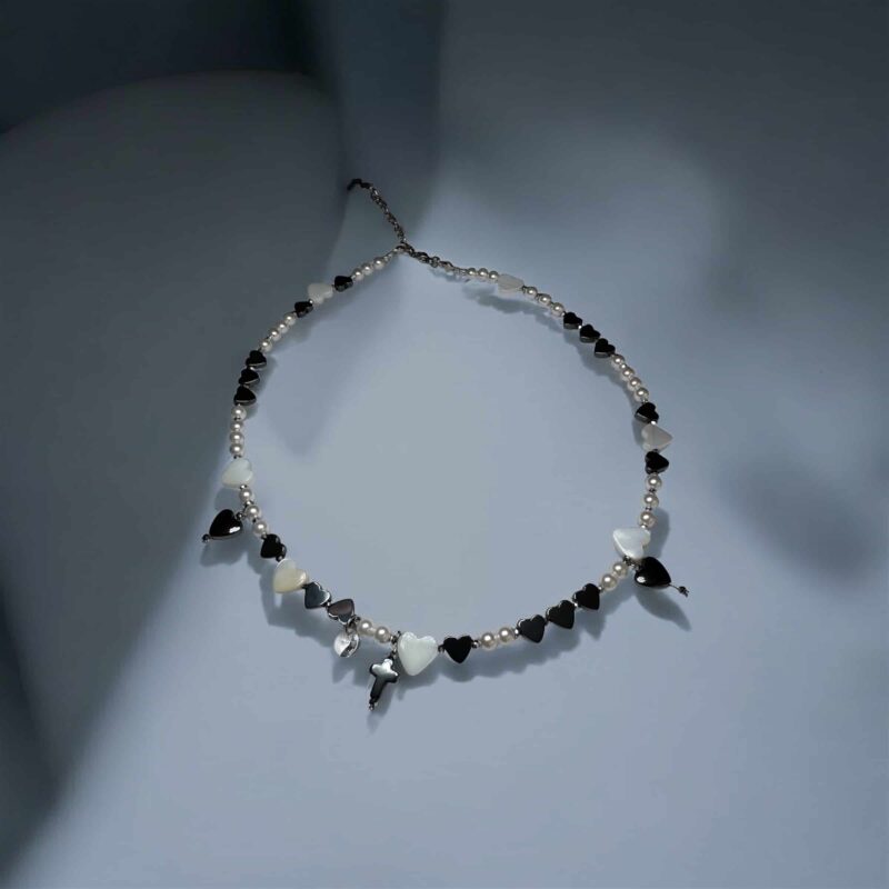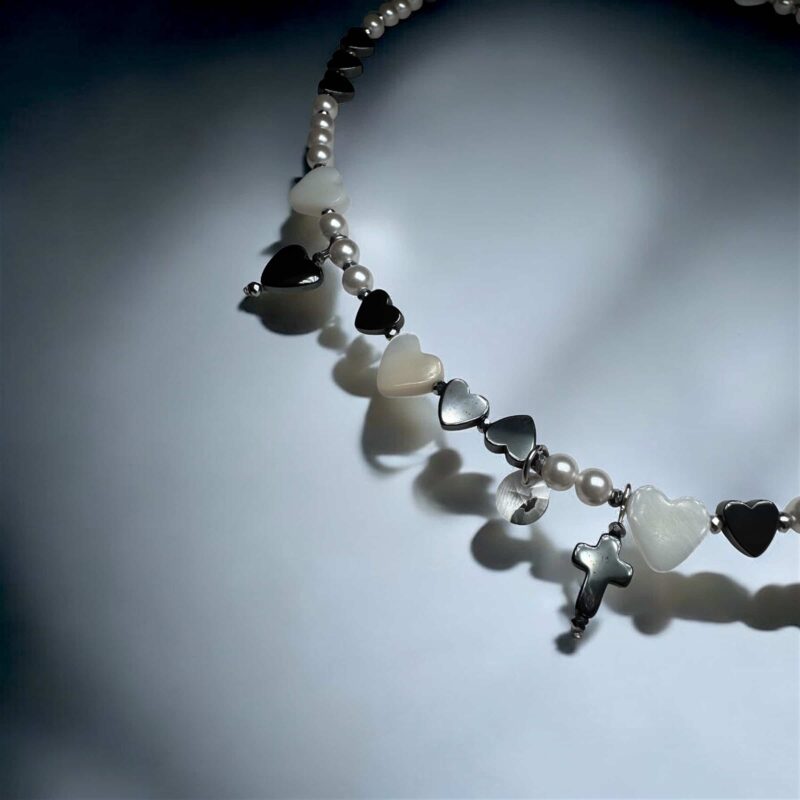 Diese feine Halskette kombiniert Herzen aus schimmernden Muschelperlen mit edlen Swarovski-Kristallen in Weiß, Grau und Schwarz. Ein graues Kreuz als Anhänger verleiht dem Design Tiefe und Symbolkraft – zurückhaltend und zugleich markant.