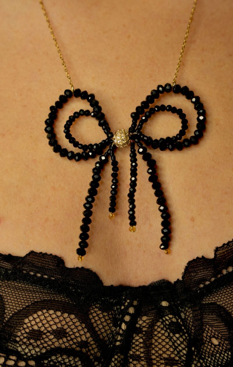 Ein Fashion Schmuckstück bestehend aus Styklo & Swarovski Kristallen. Die goldene Kugel bestückt mit Zirkon Steinen veredelt die wunderschön glänzende Schleife. Die Schleife hängt auf einer zarten goldenen Kette.