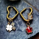 Herz Ohrringe mit den Trendblumen in verschiedenen Farben. Die Herzohrringe sind sehr besonders. Auf einem der Ohrringe ist eine stillvolle Krone zu finden, die abnehmbar ist und somit kann man verschiedene Kreationen eigenständig kreieren. Die frühlingshaften Farben sorgen dafür, dass wir alle nicht nur hübsch aussehen sondern auch gute Laune haben.