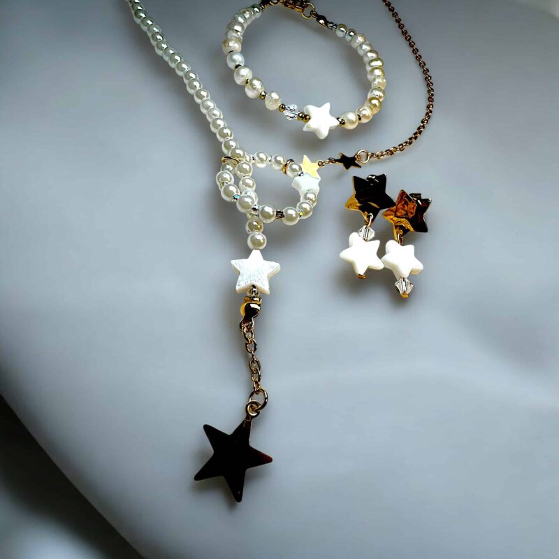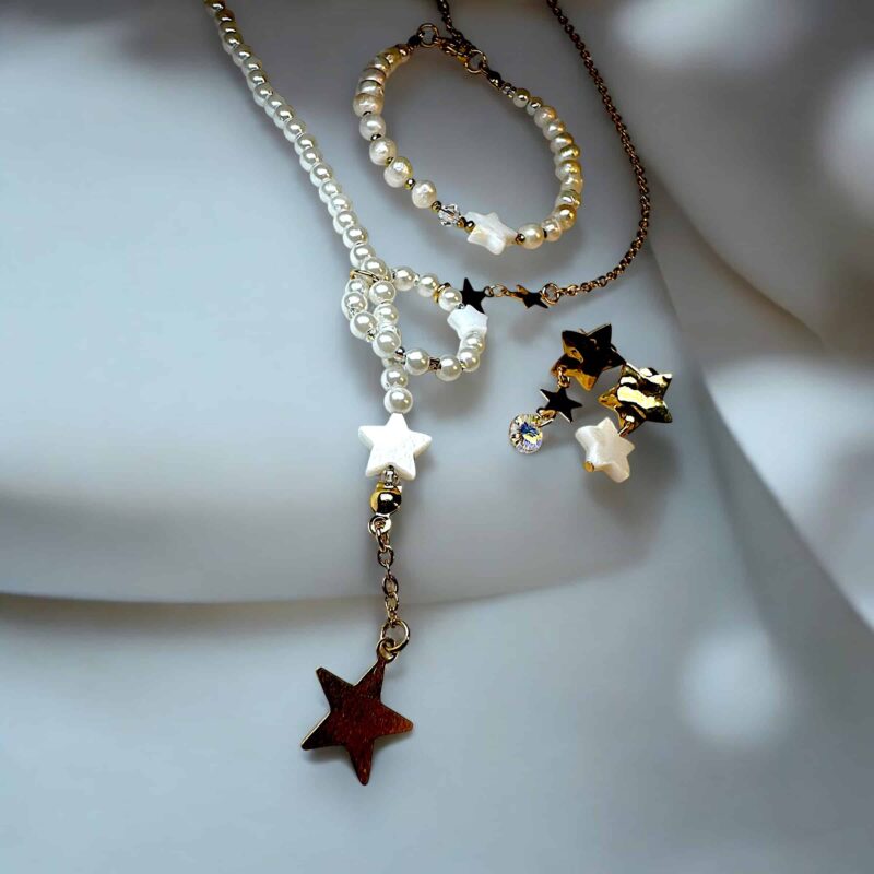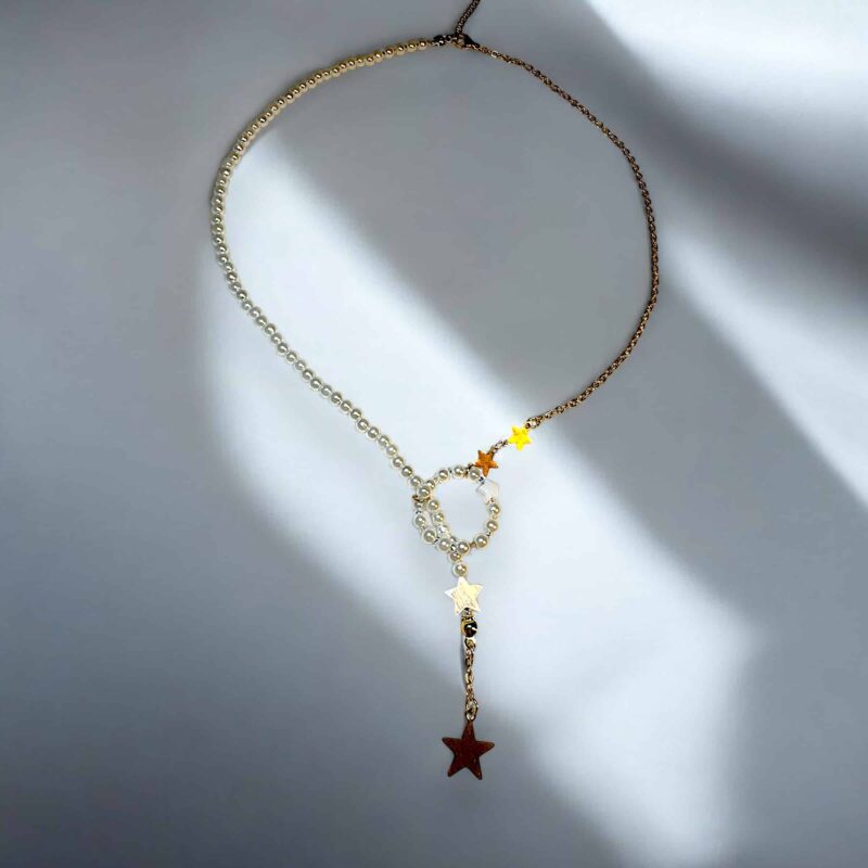 Diese atemberaubende Halskette besticht durch ein einzigartiges Design, das klassische Eleganz mit modernem Chic vereint. Ein Ring aus Perlen bildet das Herzstück der Kette, von dem sich ein zarter Ausläufer aus weiteren Perlen in eine wunderschöne Linie zieht. Der goldene Sternanhänger am Ende dieses Ausläufers verleiht der Kette einen Hauch von Glamour und einem verspielten, aber dennoch eleganten Charme. Auf der gegenüberliegenden Seite ist die Kette in edlem Gold gehalten, was das Gesamtbild harmonisch abrundet.