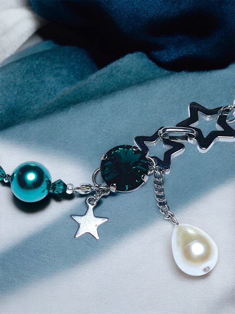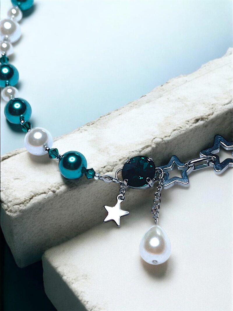 Diese moderne Halskette kombiniert neue, hochwertige Glasperlen mit funkelnden Swarovski® Kristallen. Die Perlen setzen spannende Akzente in Weiß sowie bläulich-grünen Farbtönen – eine frische, zeitgemäße Farbwelt, die sofort ins Auge fällt.