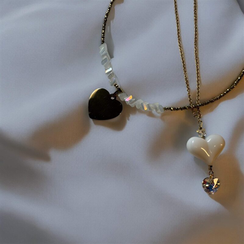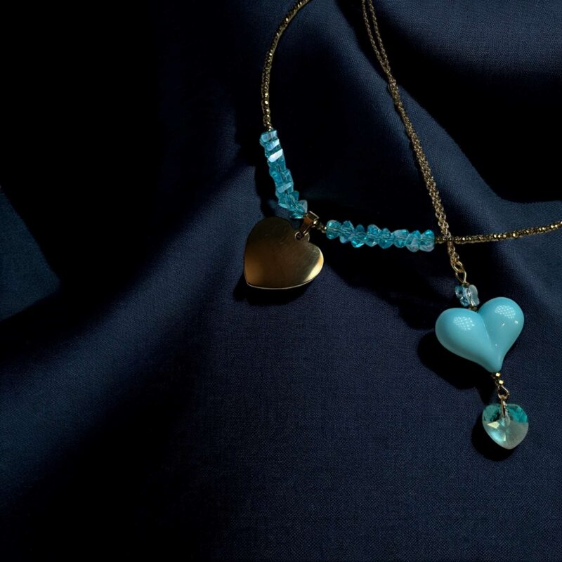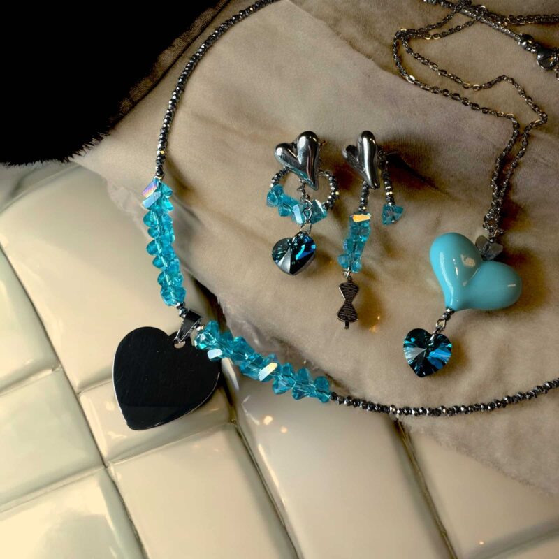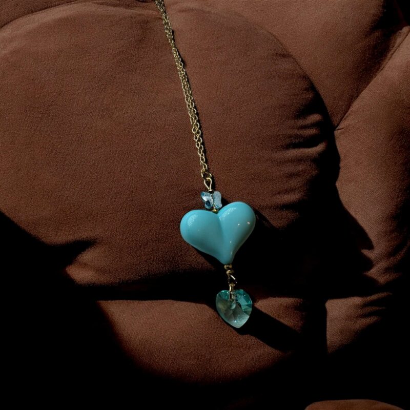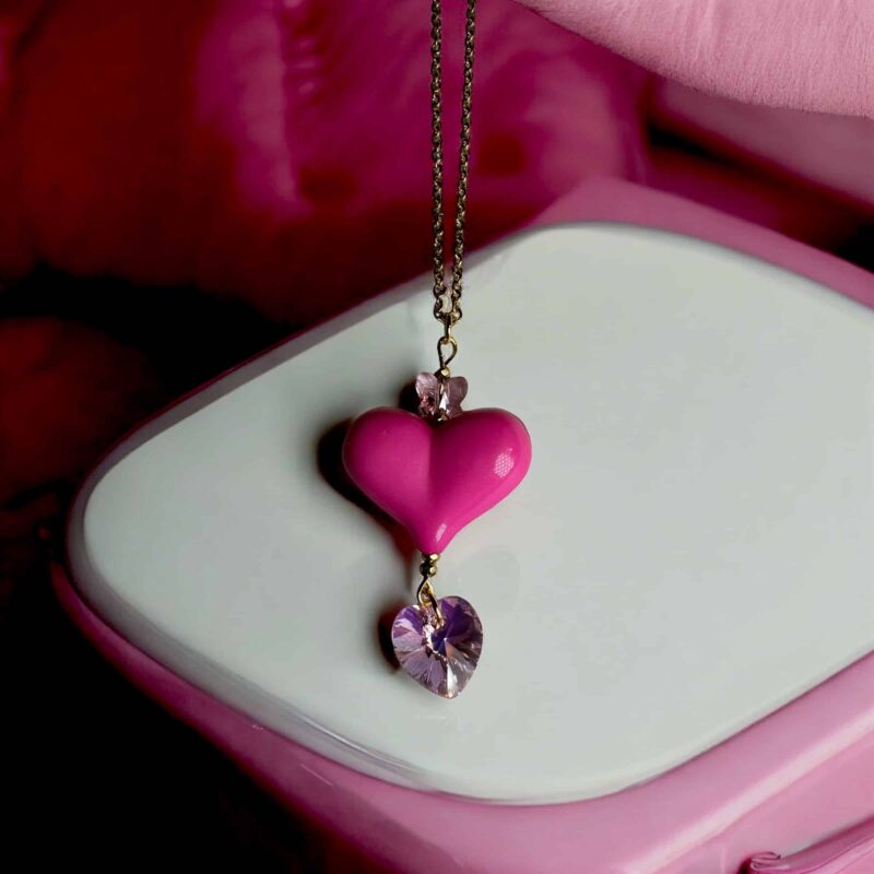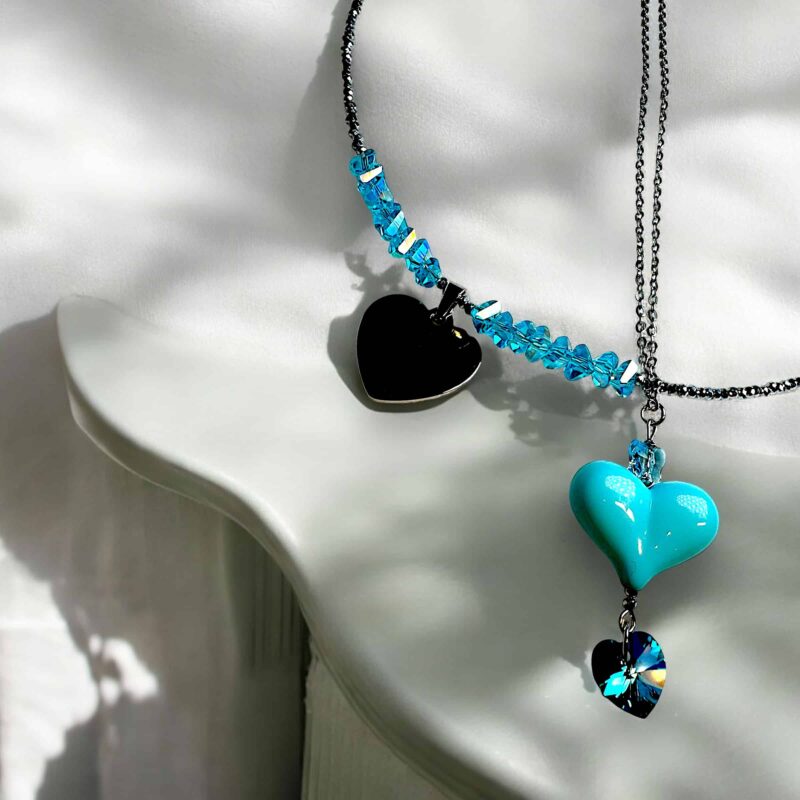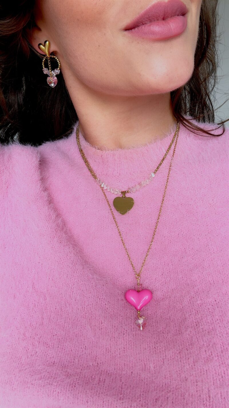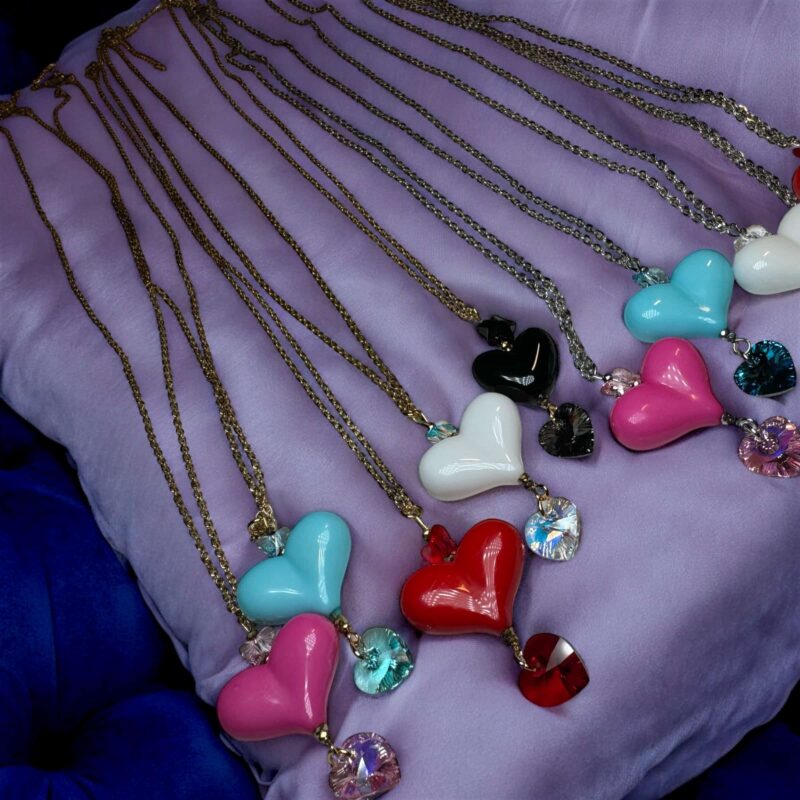 Die Kette ist in verschiedenen Farbvariationen erhältlich, sodass du deine Lieblingsfarben mühelos miteinander kombinieren kannst. Perfekt dazu passen die Ohrringe aus der gleichen Kollektion, oder die längere Version der Kette mit einem auffälligen Herzanhänger aus Acryl und zwei zusätzlichen Swarovski-Kristallen, die jedes Outfit abrunden.