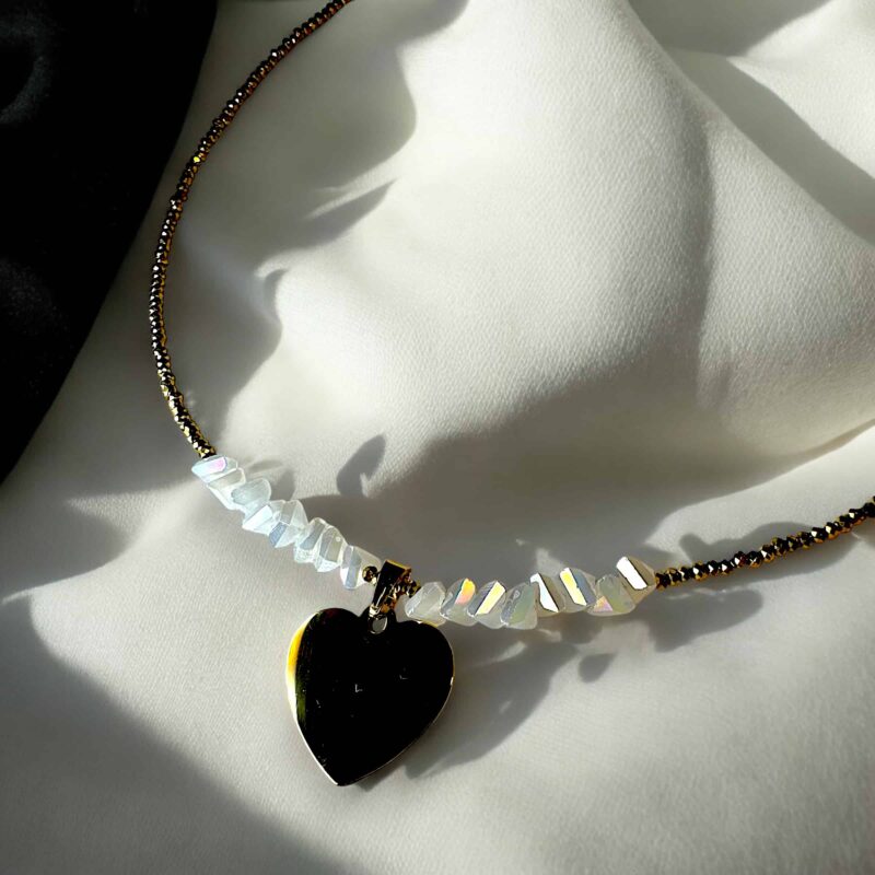 Entdecke die faszinierende Eleganz unserer Halskette, bestehend aus funkelnden Dreieckskristallen, die in ihrer schimmernden Pracht jeden Blick einfangen. Kombiniert mit den feinsten, filigranen Glasperlen in Gold oder Silber, verleiht diese Kette deinem Look einen Hauch von Glamour und Leichtigkeit. Die zarten Perlen glänzen intensiv und setzen dabei elegante Akzente.