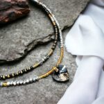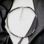 Kleine Swarovskikristalle kombiniert mit schwarzen und goldenen Styklokristallen. Eine dünne Kette, die zu jeder etwas pompösen Kette zusätzlich angezogen werden kann. Aber auch alleine sieht es filigran aus.