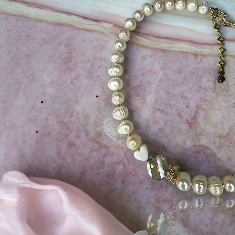 Ein Einzelstück, welches für Eleganz und Zeitlosigkeit steht. Zwei Materialien, die perfekt aufeinander passen: Echte Perlen und ein großer durchschimmernder Swarovski Kristall. Komplimentiert wird die Halskette durch ein strahlend weißes Herz und eine goldene Krone.